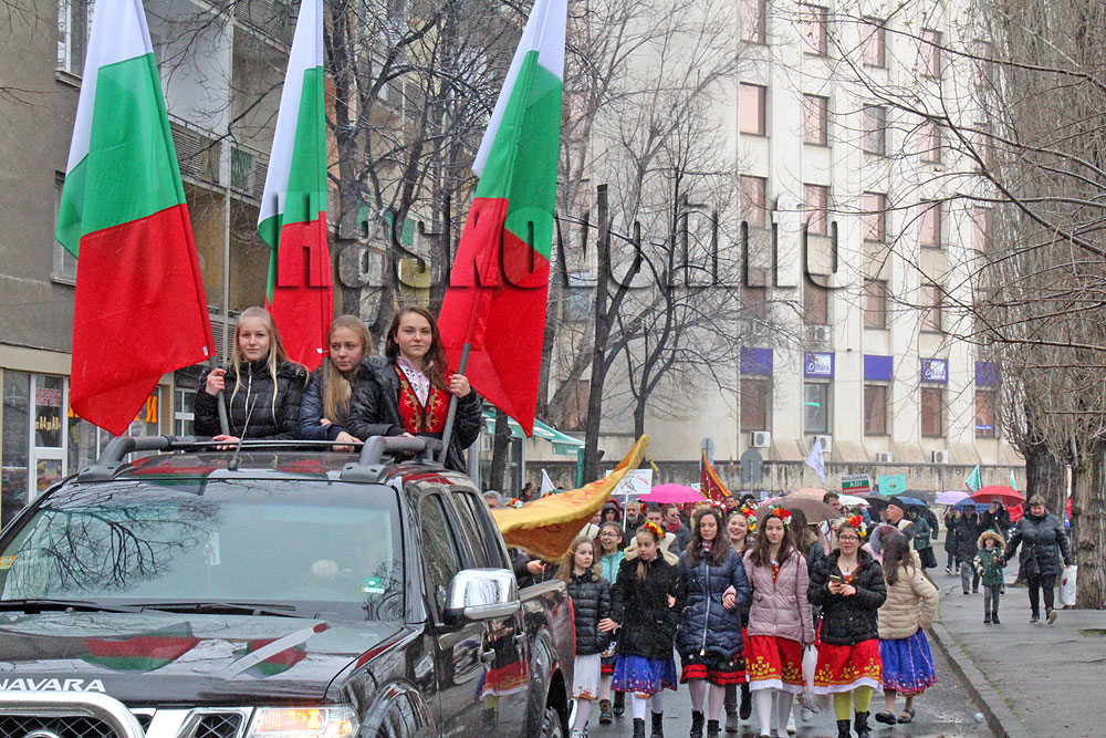 На бул. „България“ до Бизнесцентъра девойки в народни носии със знамена се качиха в кола и поведоха шествието до залата.