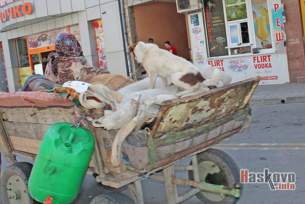 Натоварена каруца, в която се возят коза и куче, премина в ранния следобед по централния булевард „Съединение“ в Хасково.