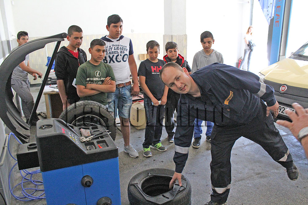 Те разгледаха изцяло ремонтирания и обновен учебен сервиз. Там е монтиран нов вертикален подемник, машини за демонтаж, монтаж и баланс на гуми, нов уред за регулиране на фарове и компютърна диагностика.