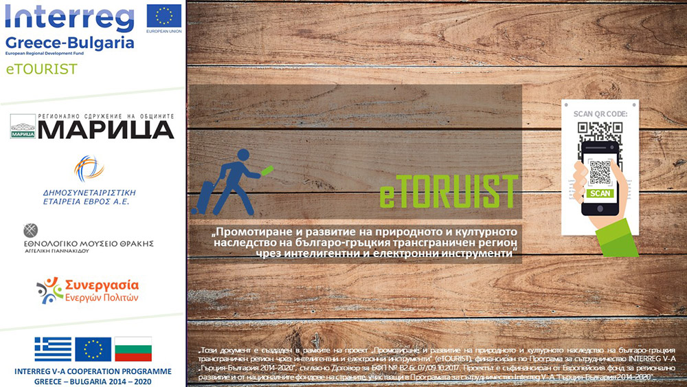 „Тази публикация е създадена в рамките на проект „Промотиране и развитие на природното и културното наследство на българо-гръцкия трансграничен регион чрез интелигентни и електронни инструменти“ (eTOURIST), финансиран по Програма за сътрудничество INTERREG V-A „Гърция-България 2014-2020”, съгласно Договор за БФП № В2.6с.07/09.10.2017. Проектът е съфинансиран от Европейския фонд за регионално развитие и от националните фондове на страните, участващи в Програмата за сътрудничество Interreg V-A „Гърция-България 2014-2020“.