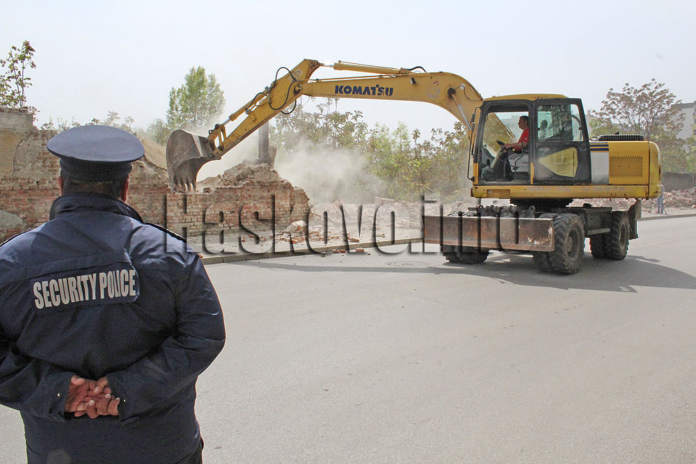 Акцията по събарянето на тухлената ограда започна около 14 ч. с помощта на багер. За безопасност общинска полиция затвори част от улицата.