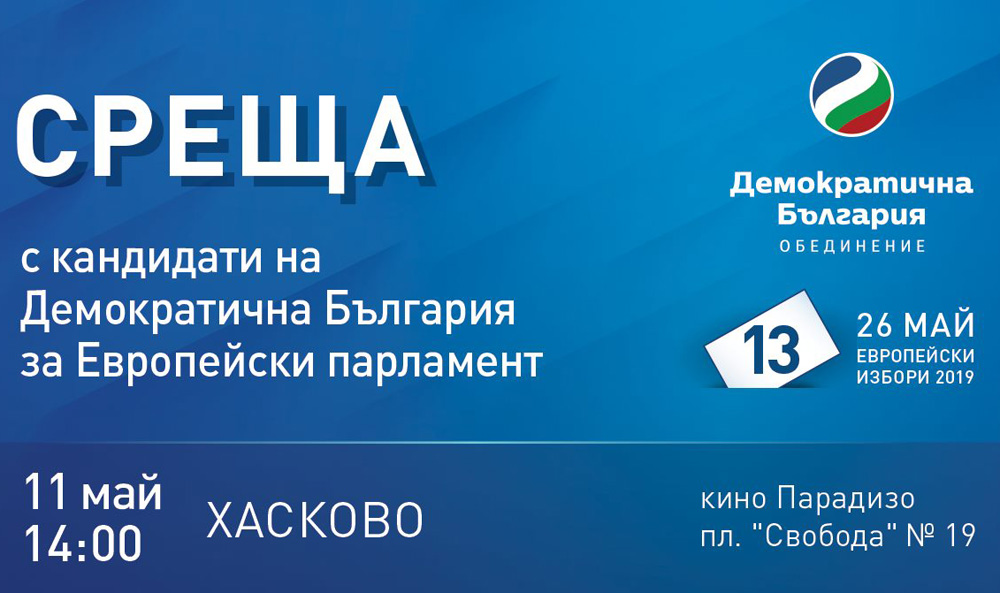 Заповядайте на среща с кандидати на Демократична България за предстоящите избори за Европейски парламент в Хасково.