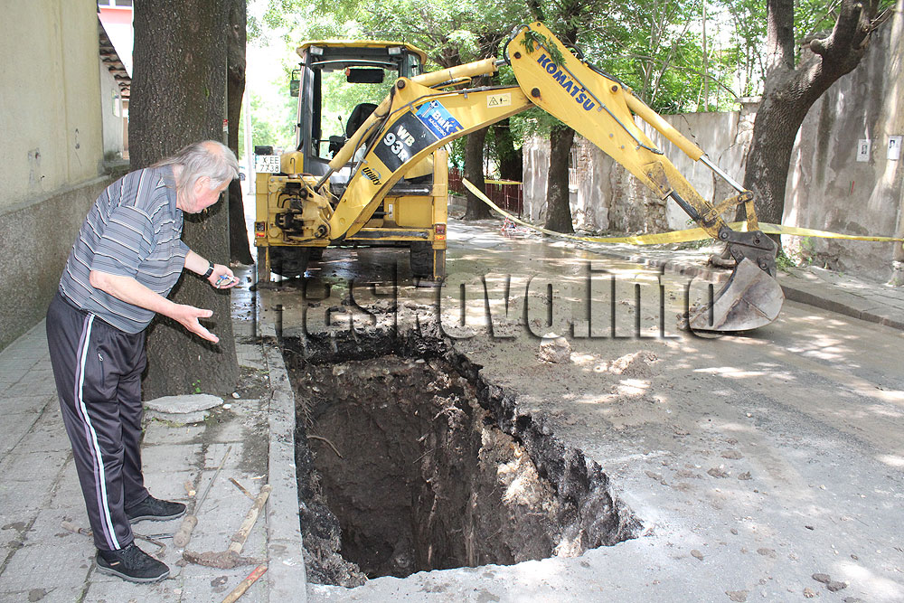 Аварийният екип и техниката на ВиК са на мястото. С багер е направен голям изкоп, защото тръбата е на по-голяма дълбочина. Улицата е затворена за движение на автомобили. Водата в района е спряна.