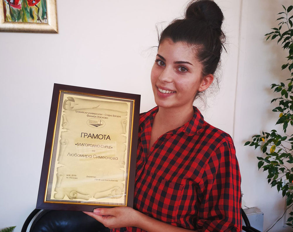 Второкурсничката в специалност „Акушерка“ в хасковския Медицински филиал Любомира Симеонова получи грамота „Благородно сърце“ от академичната общност.