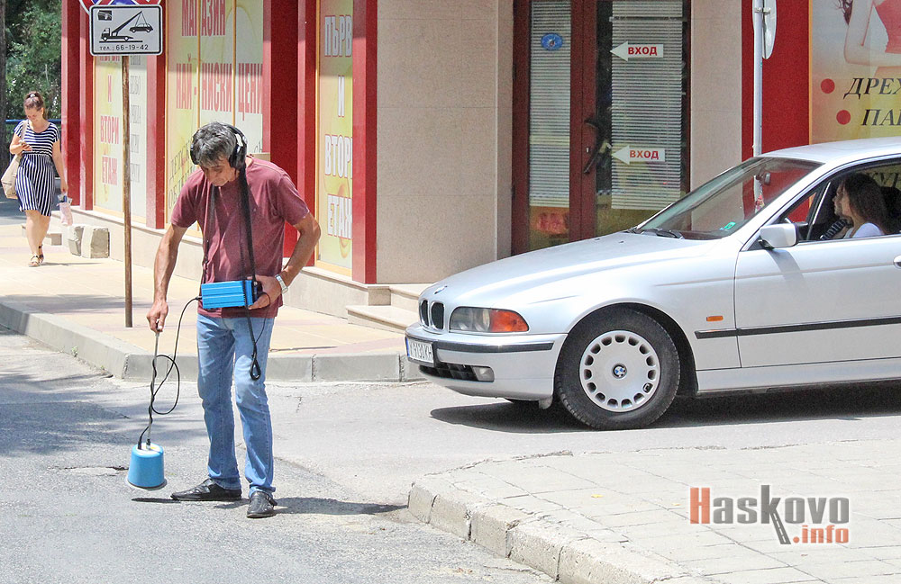 Екип на ВиК търси скрита авария зад театър „Иван Димов“ в Хасково. От водното дружество се похвалиха, че за втора поредна година са спечелили националното състезание за откриване и отстраняване на скрити аварии.