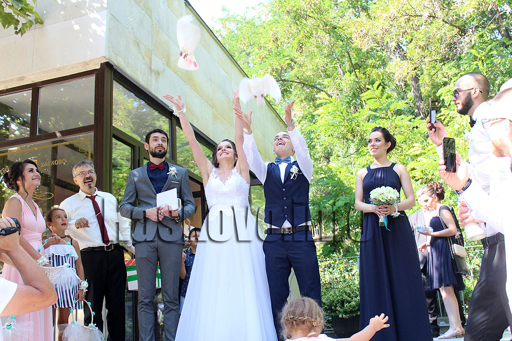 Двамата влюбени си казаха „Да“ и сключиха граждански брак след обяд в ритуалната зала в Хасково. Техни кумове са хасковлиите Люба Пенева и Антон Петков. На излизане от залата красивите младоженци пуснаха два бели гълъба в небето. След това всички си направиха обща снимка.