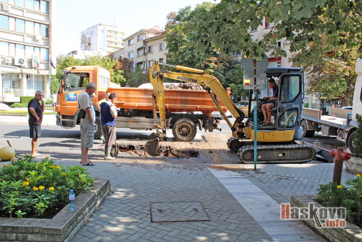 От ВиК разкопаха улицата пред сградата на НАП в Хасково заради авария. Това става след сигнал на читатели на Haskovo.info за теч.
