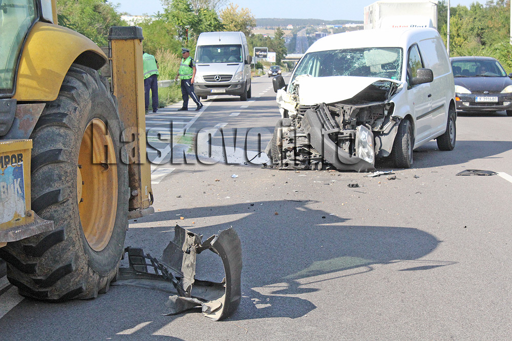 Лек автомобил Фолксваген и багер катастрофираха на входа на Хасково откъм Димитровград.