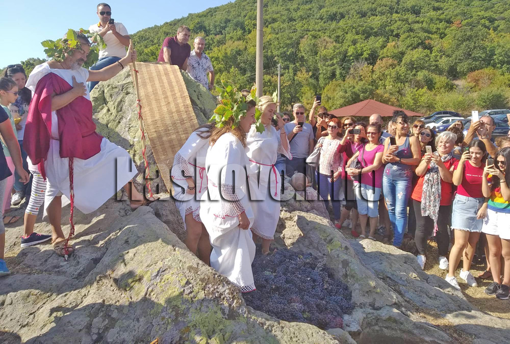 Празникът на минералната вода, здравето и красотата в Минерални бани продължи с възстановката „Мачкане на грозде в древнотракийски шарапани“.