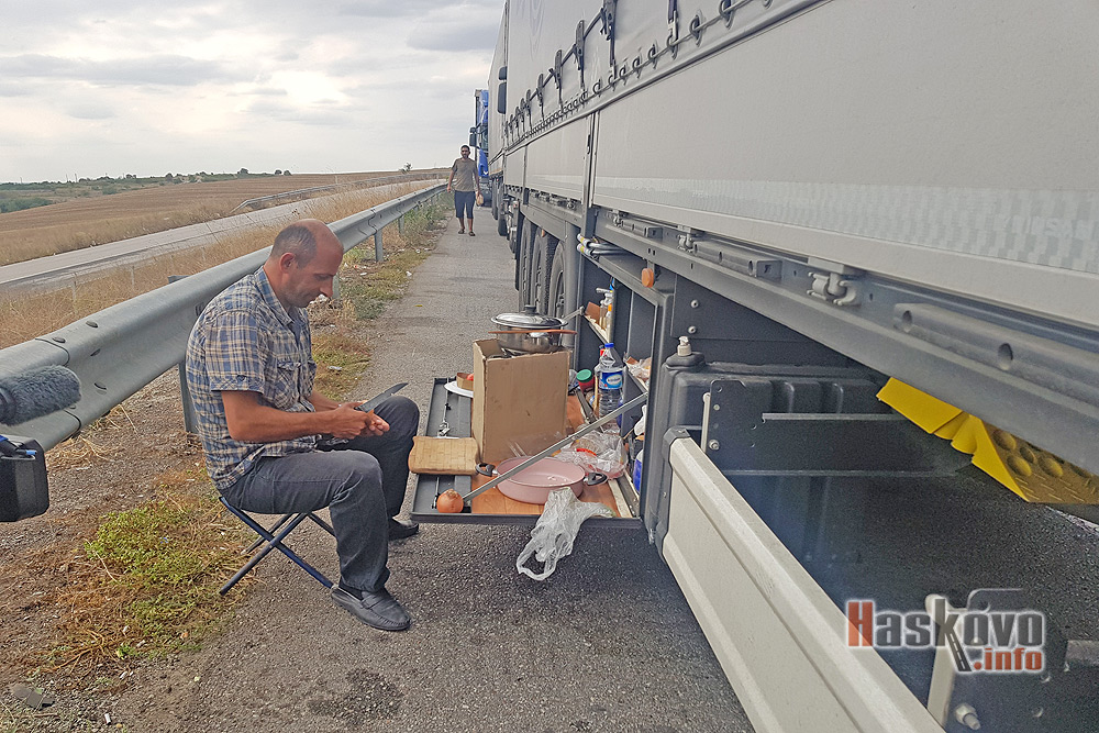 Шофьор от километричната опашка от камиони на ГКПП "Капитан Андреево" си приготвя вечерята на пътя.
