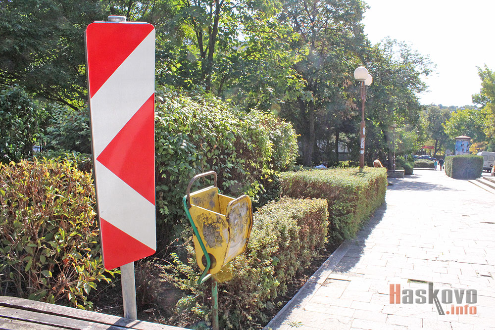 Пътен знак е преместен до кошче за боклук пред Малкия бизнесцентър в Хасково.