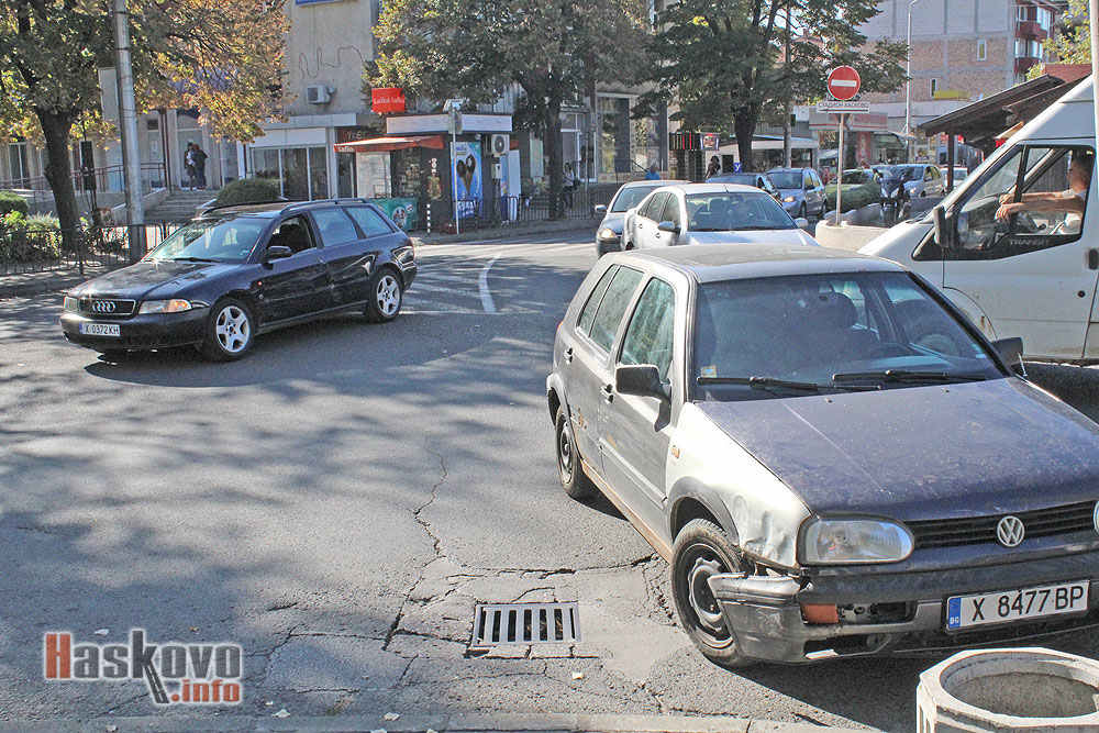 Ауди и Фолксваген катастрофираха след обяд до зеленчуковия пазар в Хасково, като при инцидента няма пострадали.