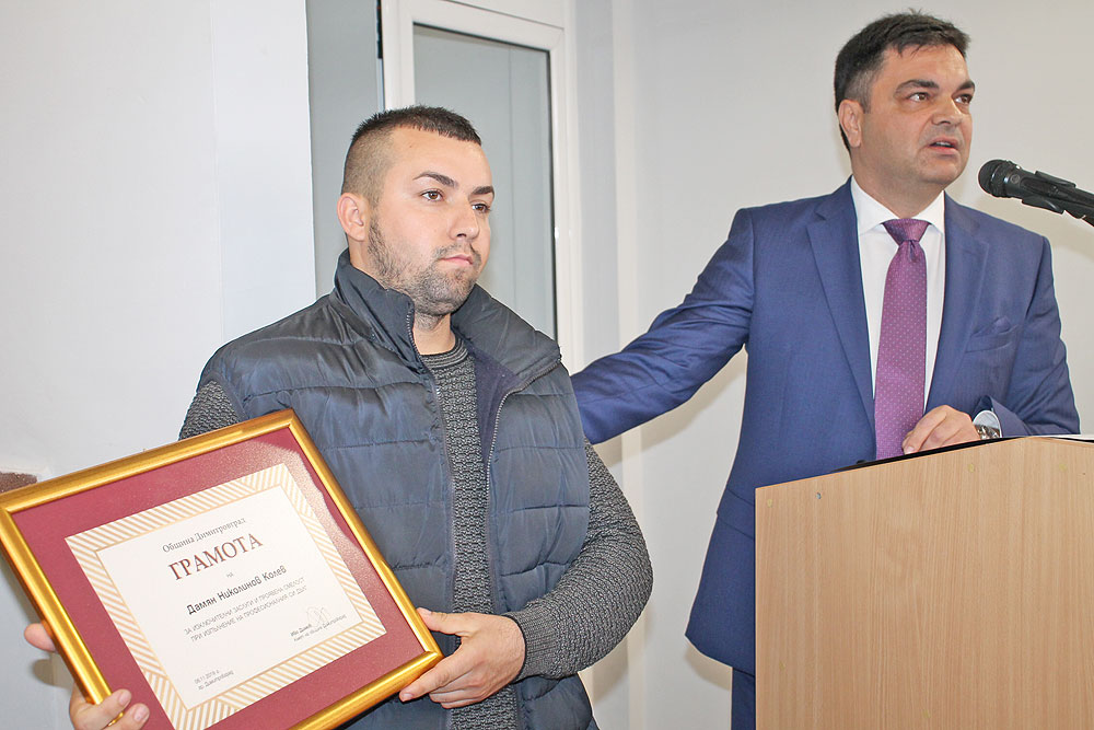Веднага след клетвата си Иво Димов връчи специално отличие на 29-годишния Дамян Колев. Haskovo.info пипомня, че вчера сутринта охранителят помогна да бъдат евакуирани 25 човека от горящото социално общежитие в града. Колев получи Грамота за изключителни заслуги и професионализъм при изпълнение на професионалния си дълг. Той получава и парична награда.
