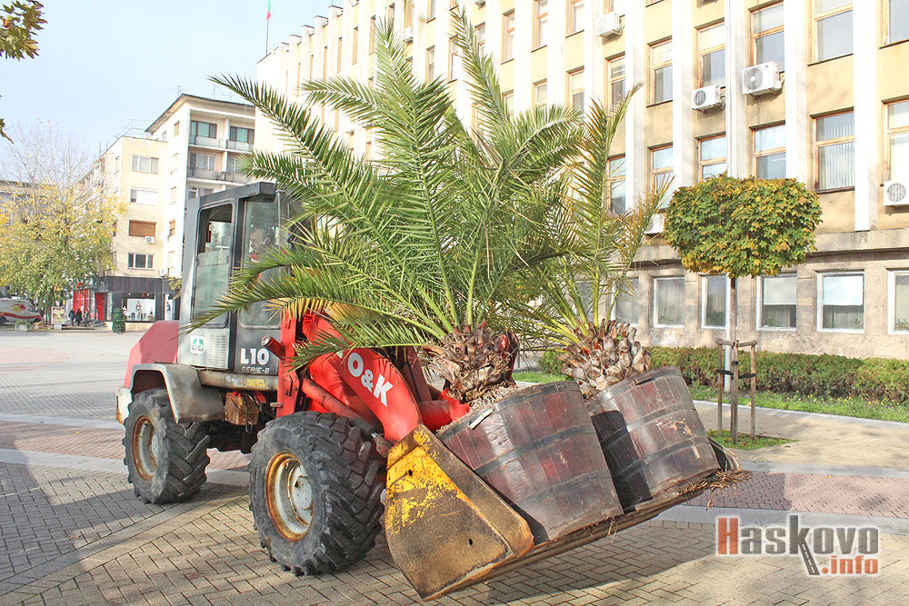 Работници от „Екопрогрес“ прибраха екзотичните растения – палми и столетници от центъра на Хасково в общинската оранжерия за зимата.