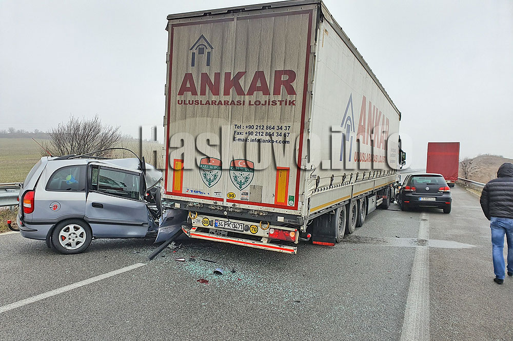 На 102 километър камионът се е нареждал на опашката, като ремаркето му е останало на пътното платно. В него се е ударила кола с кърджалийска регистрация. В автомобила са били 5 човека, включително и две деца. Всички са откарани в болница, като по първоначална информация не са сериозно пострадали. Малко по-късно, когато полицията вече регулира движението, друга кола се удря на същото място, допълниха за Haskovo.info от Пътна полиция.