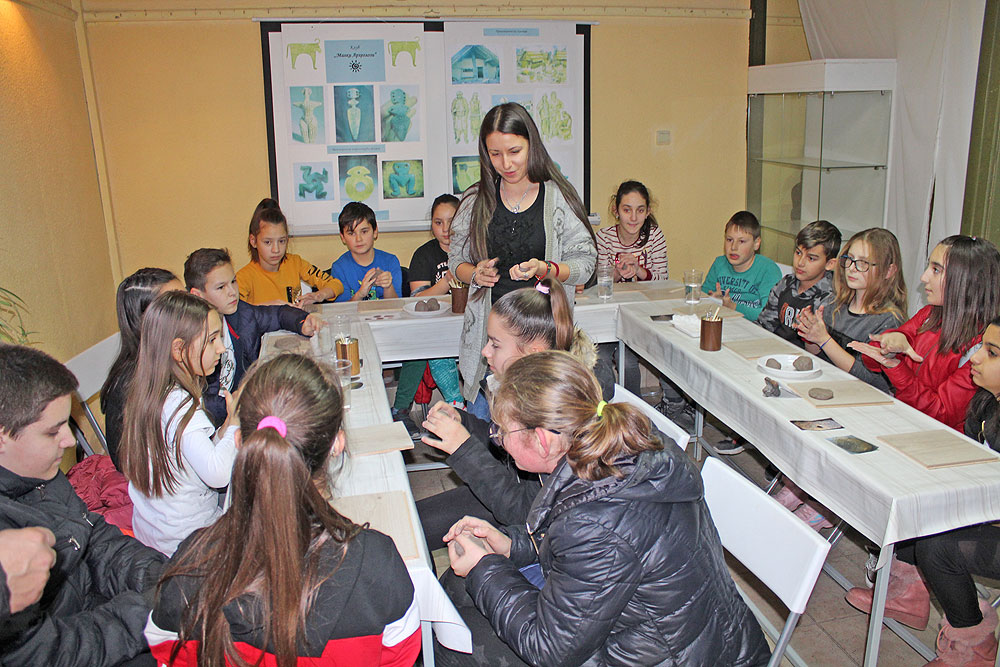 Уредникът в музея Ирена Русева запозна петокласници и шестокласници от училищата „Д-р Петър Берон“ и „Иван Вазов“ с интересни научни факти за откриваните при разкопки у нас плочки и предмети от глина с изображения и знаци върху тях.