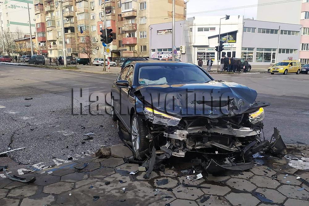 При катастрофата на кръстовището на ул. „Дунав“ и бул. „Васил Левски“ в Хасково, при която се удариха Ауди и БВМ е установено, че Аудито е отнело предимството на другата кола. Виновният шофьор и спътничката му бяха откарани в болницата с леки наранявания.