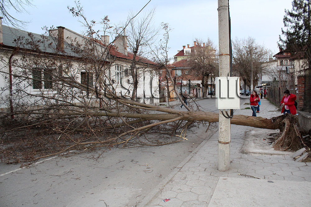Първо рухна топола на булевард „България“ до Градската градина. Движението беше за кратко спряно. С помощта и на пътни полицаи дървото беше преместено от пътя.