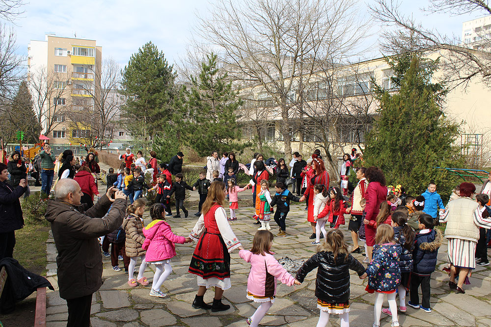 Децата посрещнаха с песни, танци и стихотворения Баба Марта, а после всички заедно се хванаха за ръце и извиха най-шареното хоро.