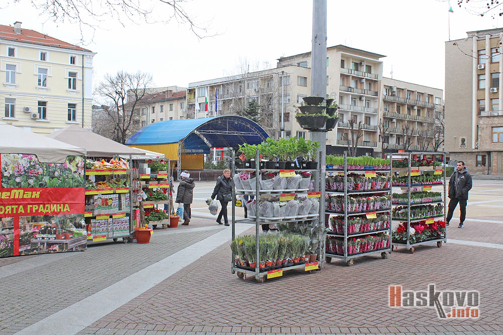 Търговци на цветя се настаняват на хасковския площад "Свобода" в навечерието на Осми март.