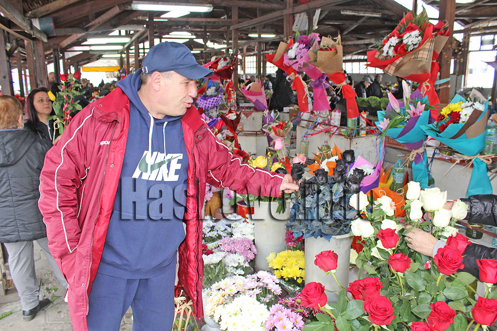 Търговците на цветя на пазара в Хасково се радват на клиенти от сутринта за Международния ден на жената – 8 март.