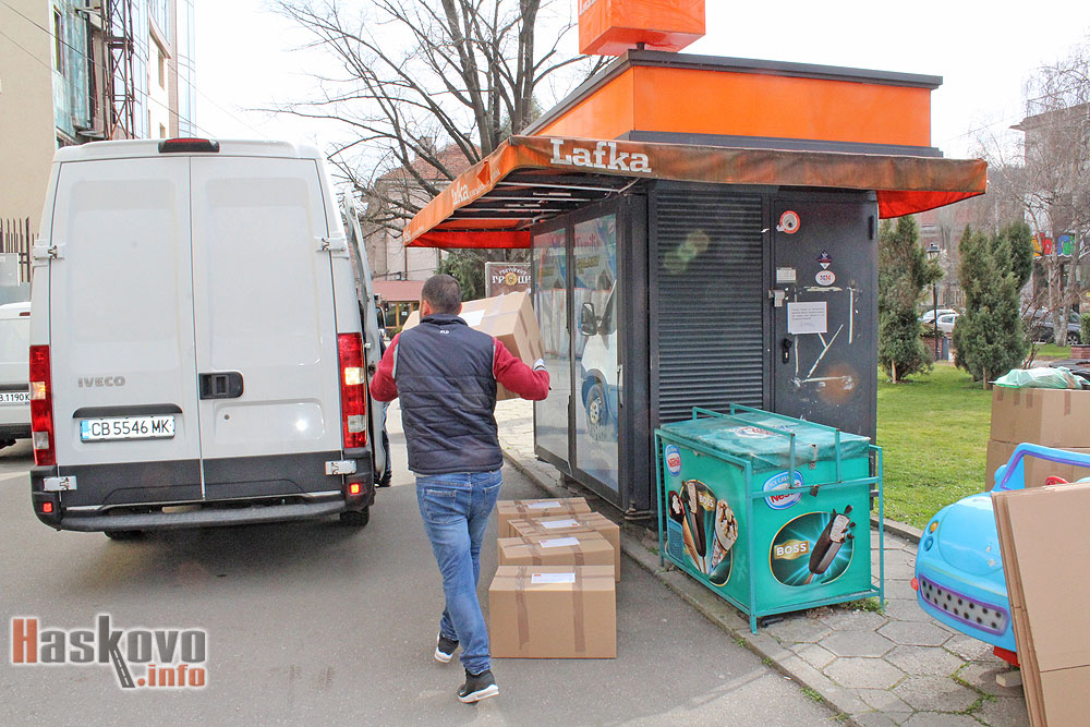 Започна ревизия на вече затворените павилиони на „Lafka“ в Хасково. Стоката им се товари и се откарва от микробус.