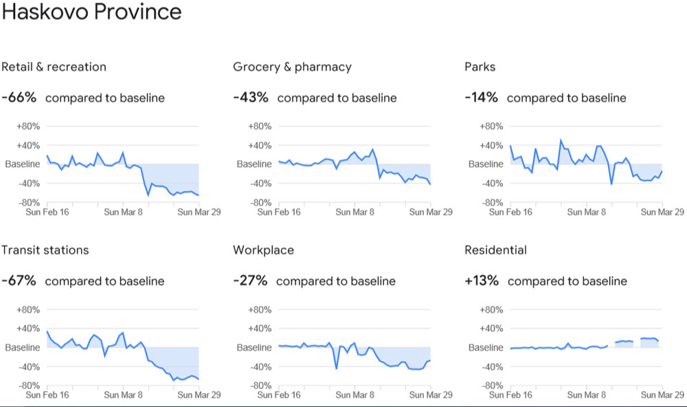 „Гугъл“ разпространи заключенията от огромен масив данни за придвижването на хората от 131 държави в седмиците на пандемията от коронавируса. Данните не са изчерпателни и вероятно реалното положение е много по-драстично, защото са събирани от потребители, които са включили на смартфоните си Location History – услуга, която поначало е изключена. Спазени са правилата за анонимност, като информацията не съдържа местоположението на конкретен потребител, неговите контакти или придвижване.