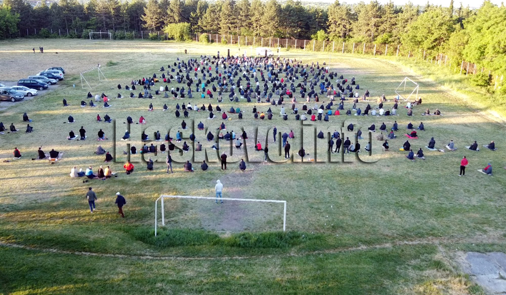 това е поредната демонстрация и провокация от тези уж миролюбиви хора, защо? първо, кой им позволи да отидат на това игрище, това че е обществено място е едно, съвсем друго е да се молят и да внушават че това място и не само е тяхно, утре могат и да си построят джамия, само защото ние българите сме толерантни, второ, както се вижда от снимките те са на същото разстояние каквото е и в джамията, така че това си е демонстрация, вижте колко сме вярващи, а нагъват свинско и пият ракия и жените им умират за необрязани …, затова следващия празник си го празнувайте в джамията!