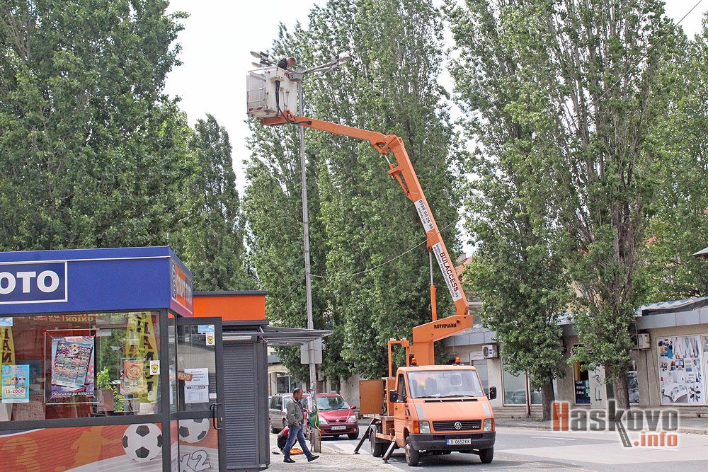 Работници ремонтират повредени лампи по булевард „България“ до комплекс „21 век“ в Хасково.