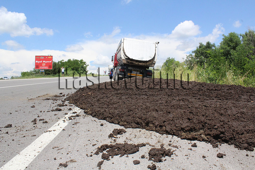 В ранния следобед камион изсипал част от товара си в аварийната лента. Това е станало на стръмен участък и най-вероятно случайното отваряне на капака е причината да се изсипе тора.