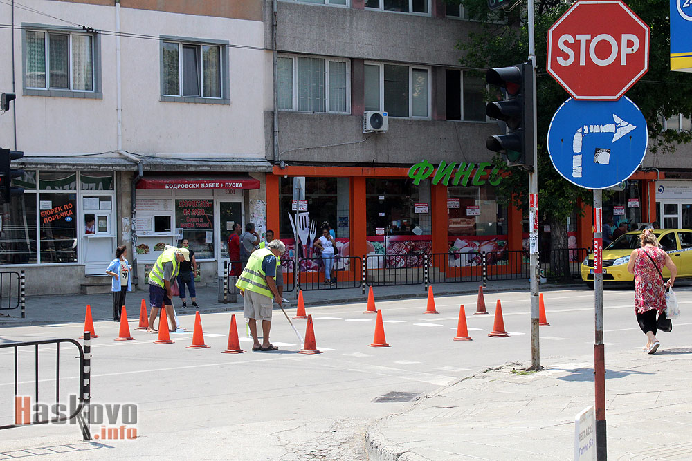 Работници освежават маркировката на една от пешеходните пътеки до автогарата в Хасково.