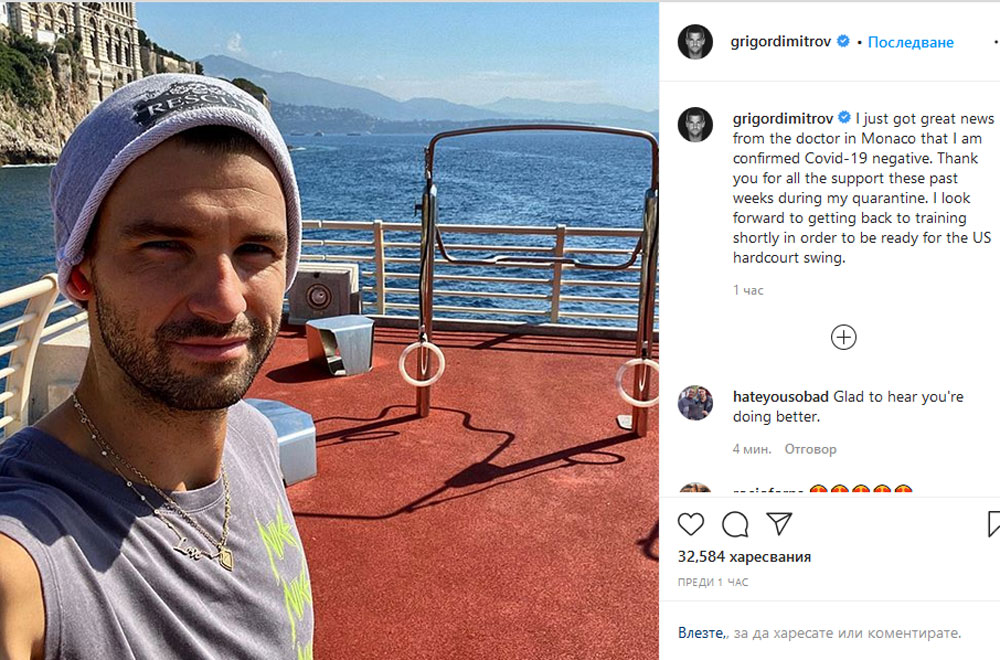 „Точно получих чудесни новини от доктора си в Монако – отрицателната ми проба за коронавирус е потвърдена. Благодаря ви за подкрепата през последните седмици по време на моята карантина. С нетърпение очаквам да подновя тренировките си, за да бъда готов за американския Тур на твърди кортове“, написа хасковлията в Instagram.