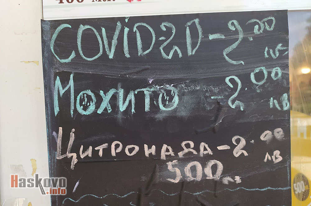 Търговец на безалкохолни напитки в центъра на Хасково кръсти един от продуктите си „COVID-20“. Сред съставките на коктейла са мента и зелена ябълка.