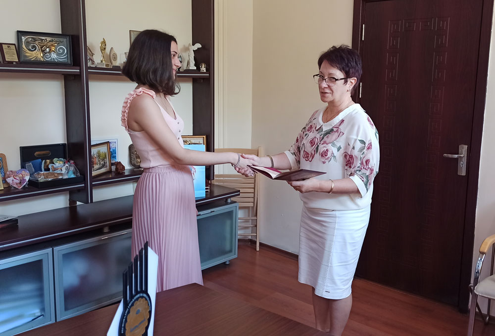 Възпитаничката на езикова гимназия „Проф. д-р Асен Златаров“ Диана Запрянова получи документа си от началника на Регионалното управление по образование Христина Боева след онлайн церемония, в която участваха ръководството на министерството и 44-мата удостоени с национални дипломи.