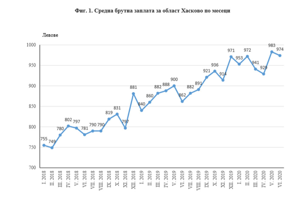 С най-висока средна заплата е София – 1 822 лв., а с най-ниска е област Благоевград – 886 лв. Средната месечна работна заплата за страната е 1 337 лв. – с 375 лв. по-висока от тази в Хасковска област.