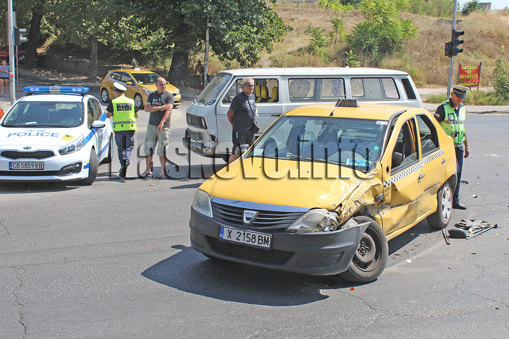 Инцидентът стана малко преди обяд. Таксито, което не е превозвало клиент, се е спускало откъм АГО. Бусът пък е идвал откъм автогарата и се е опитал да завие наляво към квартал „Орфей“ и е последвал удара.