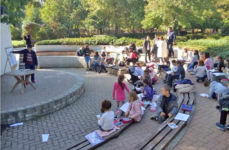 Изнесен съвместен урок проведоха единадесетокласници от специалност „Екскурзоводство“ на Професионална гимназия по туризъм „Александър Паскалев“ и второкласници от ОУ „Св. Климент Охридски“ на импровизираната сцена в градската градина.