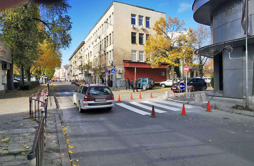 Днес изместената „зебра“ се маркира, готови са вече и подстъпите за детски и инвалидни колички. Когато е напълно завършена, ще бъдат преместени и загражденията.