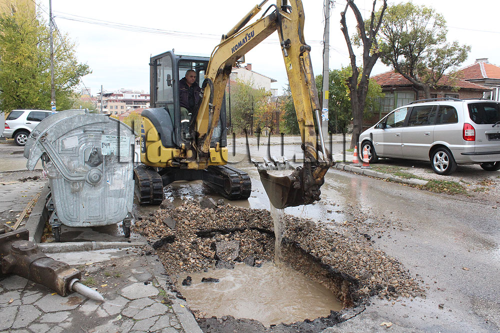 Тази сутрин багер на ВиК разкопа проблемното място и започна отстраняването на аварията. Спира се водата на блоковете в района. Очаква се аварията да бъде отстранена до края на деня.