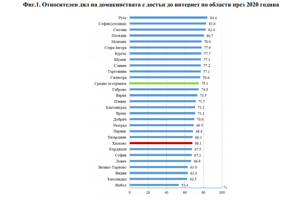 78.6% от домакинствата в Хасковска област имат достъп до интернет в домовете си в Хасковска област през 2020 г., съобщават от Териториално статистическо бюро – юг при Националния статистически институт.
