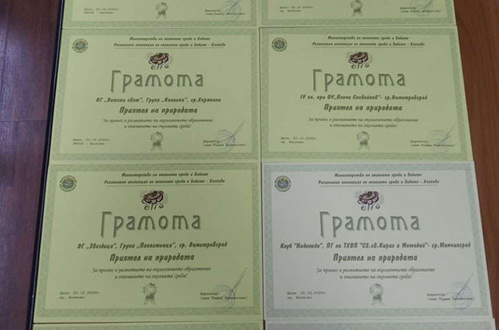 За десета поредна година Регионалната инспекция по околната среда и водите в Хасково отличи с грамоти и награди „Приятел на природата“ 10 училища, детски градини и екоклубове за принос в опазването на околната среда и в развитието на екологичното възпитание на подрастващите.