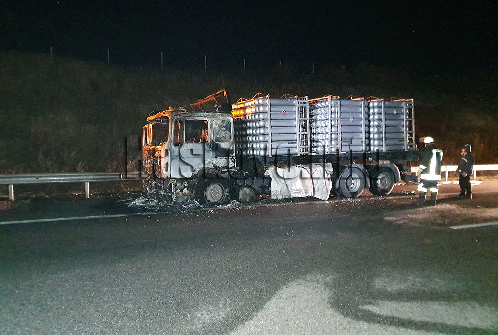 Две секции с газови бутилки са изгорели с опожарения камион на магистралата