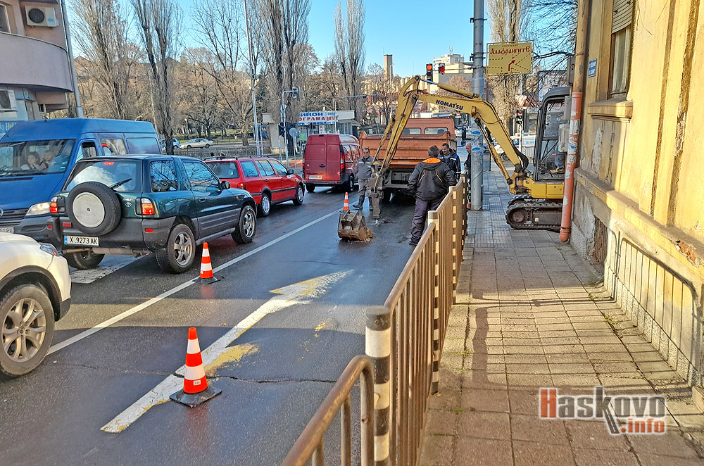 Екип на ВиК отстранява авария на булевард "Съединение" до зеленчуковия пазар в Хасково.