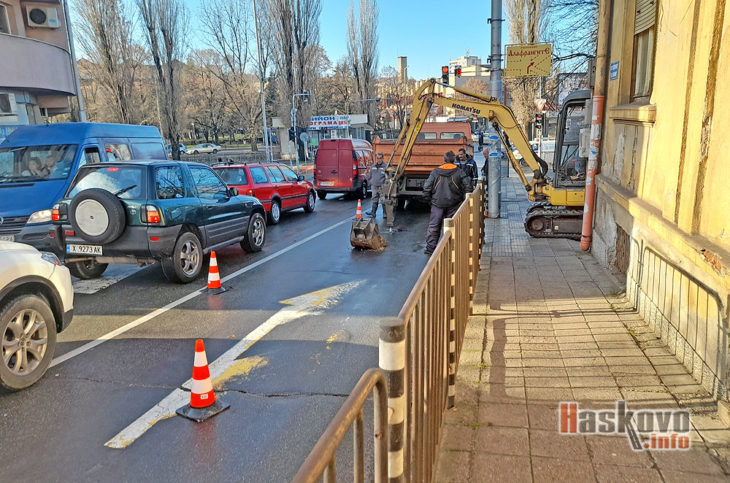 Екип на ВиК отстранява авария на булевард „Съединение“ до зеленчуковия пазар в Хасково.