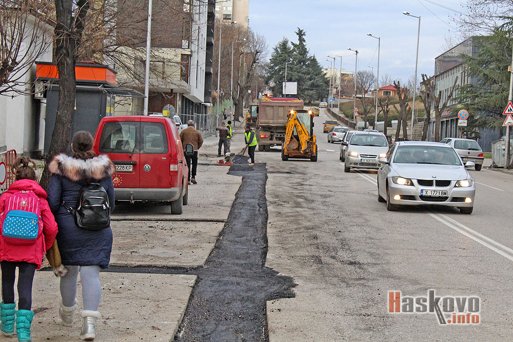 Работници асфалтират в участъка на хасковския булевард „Стефан Стамболов“, където беше положен нов водопровод.