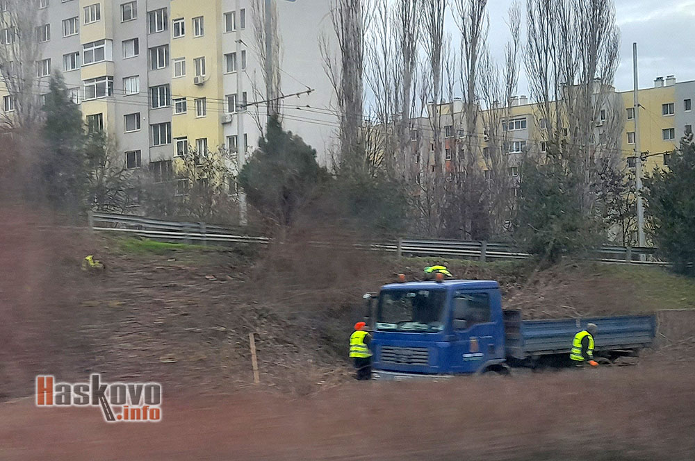 Работници режат храстите и дърветата на входа на Хасково откъм Димитровград.