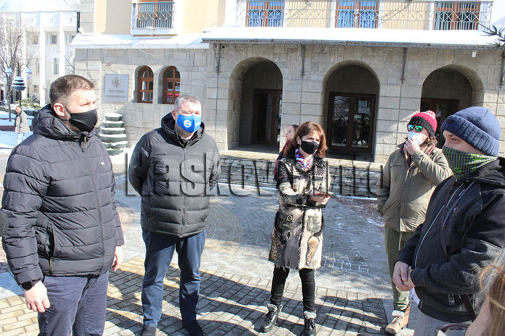 Няколко хасковлии, организирали се в социалните мрежи се събраха по обяд пред сградата на общината с въпроси към кмета за заледени улици и тротоари в областния град. На въпросите им отговориха Станислав Дечев и заместникът му Динко Тенев.