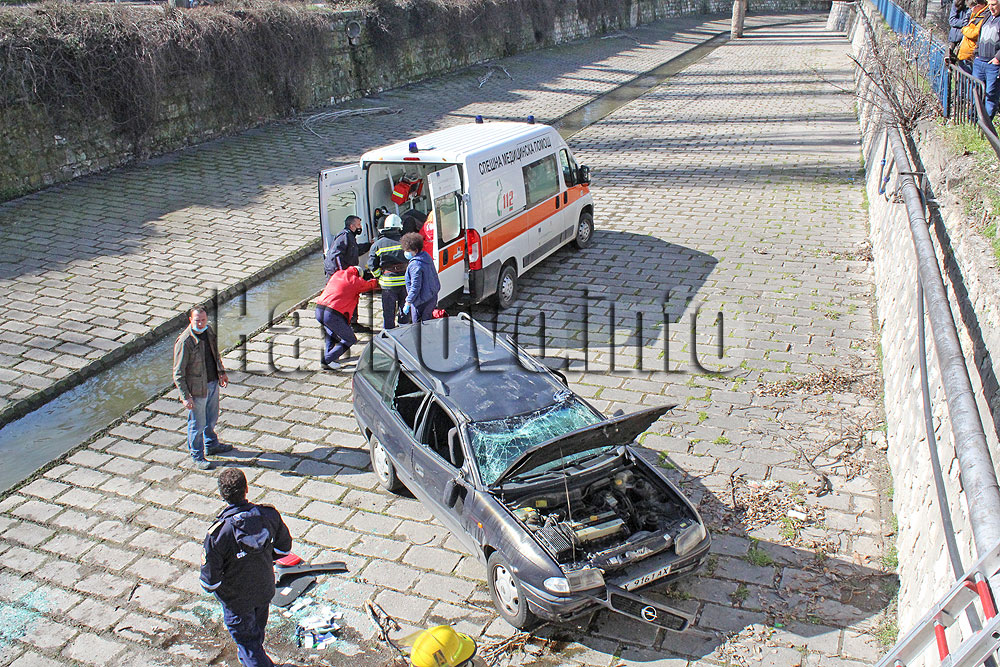 Инцидентът стана около 11 часа при интензивен трафик в областния град. Колата се е движила по булевард „България“, когато е била засечена от друг Опел излизащ от моста. Удареният Опел се е завъртял и е паднал в коритото на реката.