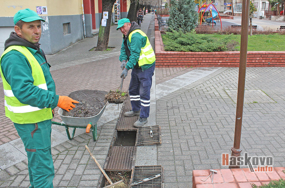 Работници на "Екопрогрес" отпушват шахти в пешеходната зона на Хасково.