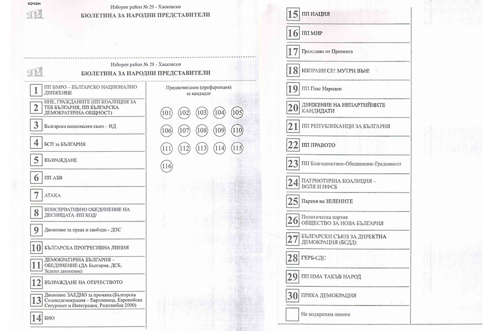 Тя включва 30 партии и коалиции подредени по реда, изтеглен в жребий от Централната избирателна комисия, както и квадратче „Не подкрепям никого“. В дясната й част са кръгчета, номерирани от 101 до 116, колкото е максималният брой на кандидатите в една партийна листа.